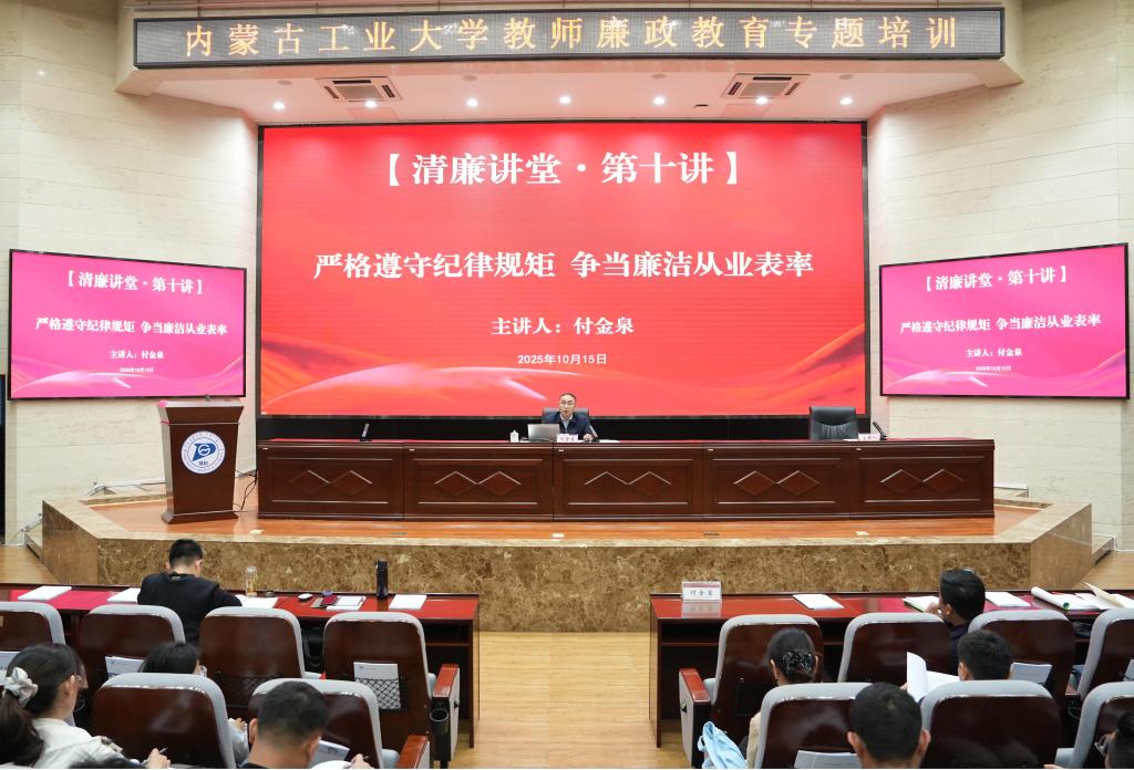 10月15日,学校纪委联合教师发展中心在明德楼第一报告厅面向2025年新教师教学能力培训班全体教师及学校年轻干部、部分学生党支部书记举行廉洁教育专题培训,由校党委委员、纪委书记付金泉作专题讲座。